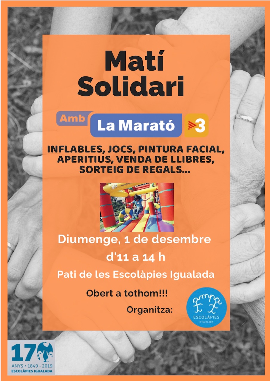 Demà tindrem un matí intens! Amb les activitats per «La Marató de tv3» amb l’AMPA de les Escolàpies d’Igualada. També al matí serem amb Vilanova Comerç a la Fira de Nadal amb Tallers i Jocs de fusta.